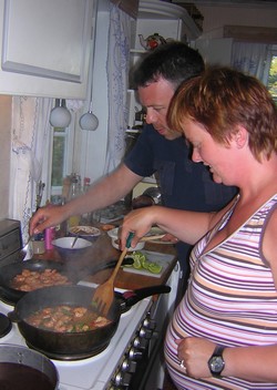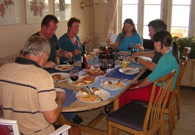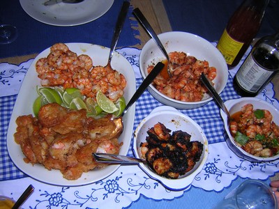 Til middag spiste vi først en forrett av elgkjøtt med spinat og snennepsaus. Hovedretten var scampi i ale farger og fasonger: Fritert, vanlig stekt, saltet, sursøt og chili- versjoner. Vi (iallfall noen av oss) ble opptil plagsomt mette! Men vi klarte å presse inn et kakestykke fra kaken som Helen hade laget…
