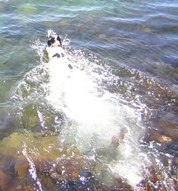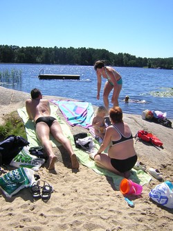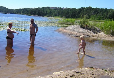 Vi tok turen til den "unaturlige" sandstranden ved Kvernhusvannet. Vannet var minst 25 grader! Når jeg bader frivillig og NYTER det, da er det varmt vann. Vilja var vilt begeistret for det, men mislikte (merkelig nok) å få sand i øynene…
