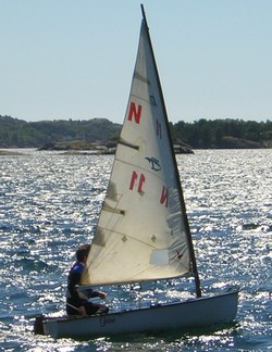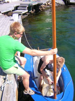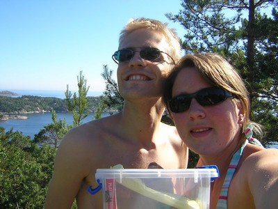 Fremdeles sol! Strålende! Slik vi vil ha det! Kristine og Magnus kjøpte våtdrakterfor å kunne seile skikkelig! Det kan kreves ettersom båten er beregnet for to.