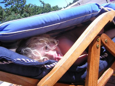 En sløvedag! Og herrrrrrlig er det! Vi har valset rundt i dag, sløvet, spist, drukket litt øl og til og med seilet litt. Vilja fikk brukt både basseng og båt samtidig. Kristine prøvde to ganger på det samme, men siden hun er over tyve år eldre resultere det i to våte shortser…