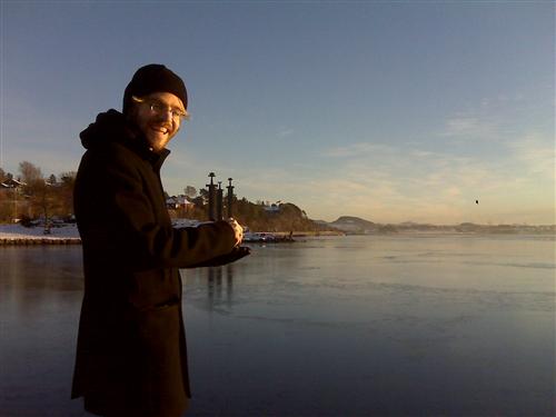 Magnus kaster småstein på isen for å sjekke styrken, og ettersom steinen (i lufta, se bildet) gikk igjennom, konkluderte han med at den ikke ville tåle hans vekt.