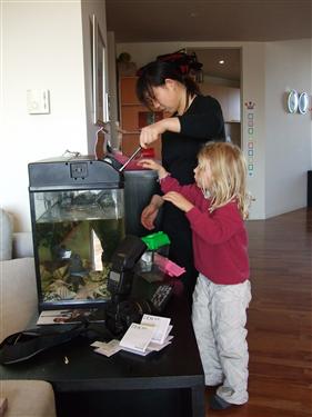 Geir og Helen spanderte sitt hellige pinnekjøtt på oss, og Vilja og Nori var i strålende humør. Jentene har lært mye nytt språk, Nori tok lekehunden sitt i ørene og proklamerte "it's a dog!". Vi hadde med presanger fra hele familien så kvelden ble avsluttet med en "julaften".