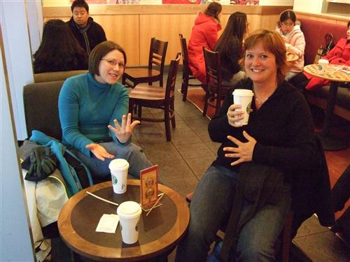 Vi drakk god kaffe på Starbucks, handlet litt til og spiste med Geir på kafeen Element Fresh. Geir tok oss med til OL-stadion. Nydelige bygg og stilige juletrær, men pokker så kald vinden er! Så stod en times massasje og pedikyr på programmet. Vi er trøtte nå.