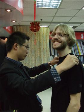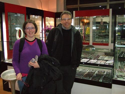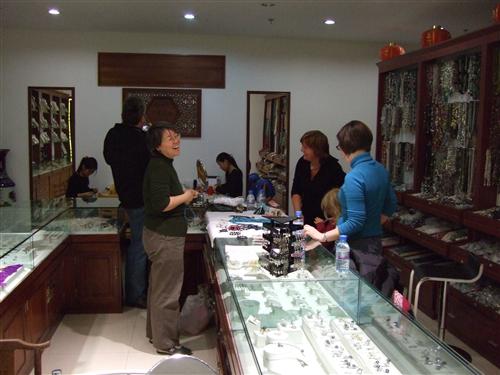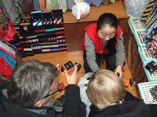 Vi stakk innom ambassaden for å hente Geir, det er tid for mat. Kinamat i Kina er nydelig! Geir tok oss med på brillemarkedet, og vi handlet 2-3 par briller hver. Snittprisen på briller med glass var på rundt 350 kr, en veldig rimelig pris sammenlignet med hjemme. Så gikk vi til silkemarkedet for å begynne å lære å prute, og her gikk det skikkelig for seg (synes jeg da, Geir sa det var veldig rolig i dag).