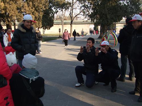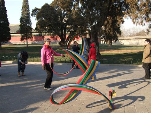 2009, here we are! Vi fikk oppleve litt kinesisk hverdagskultur parken. I utgangspunktet hadde vi tenkt å dra til Den Underjorddiske Byen, men den var stengt på grunn av oppussningsarbeider, "vi åpner kanskje neste år". Parken "Tempel of Heaven" gav imidlertid masse underholdning. Her spiltes det alverdens musikk og spill, karaoke og dans var det også. Parken hadde egne treningsanlegg for eldre, imponerendes (og morsomt).