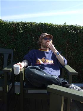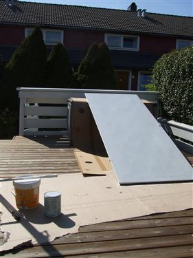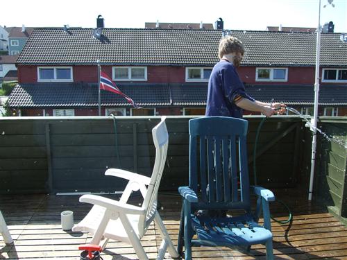 Det var forholdsvis varmt og sol så det måtte utnyttes. Magnus vasket terrassen (og stolene) over stua, Kristine malte døra på "gamle teknisk" og plantet noen planter i bedet.
