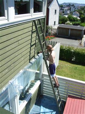 Etter husvask og påfølgende malingskraping (weee!) følger den fantastiske husmalingen. Og siden vi er så snille, malte vi naboens del også! 🙂