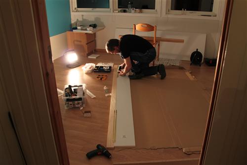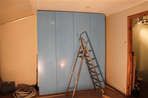 Iallfall nesten! Vi fikk montert den siste skapdøra (inn mot veggen, et eget skap for f.eks. strykebrett) og det siste skapet. Og plutselig var det ferdig!