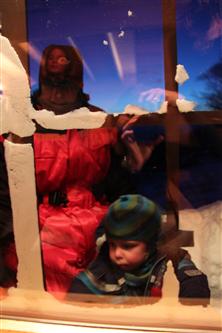 Magnus lekte i snøen på utsiden av vinduet