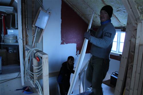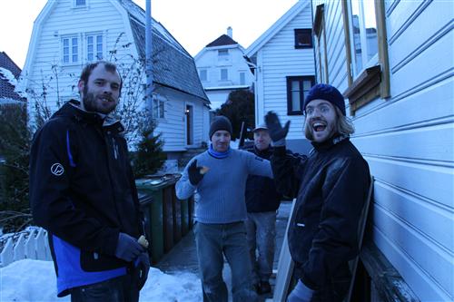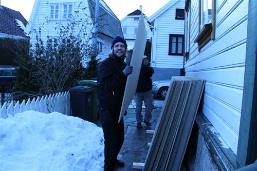 65 plater skulle bæres inn og opp en smal trapp. Snille som vi er, stilte vi på oppfordring. Vi fikk boller og grøt etterpå.