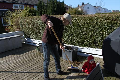 Hjelper pappa med å koste løv